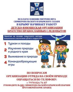Джерело (фотоілюстрації): https://crimea-eparhia.ru/eparchy-2013/24229-pri-sodejstvii-sinodalnogo-otdela-po-delam-molodezhi-rpts-v-krymskoj-mitropolii-obrazovany-novye-otryady-bratstva-pravoslavnykh-sledopytov