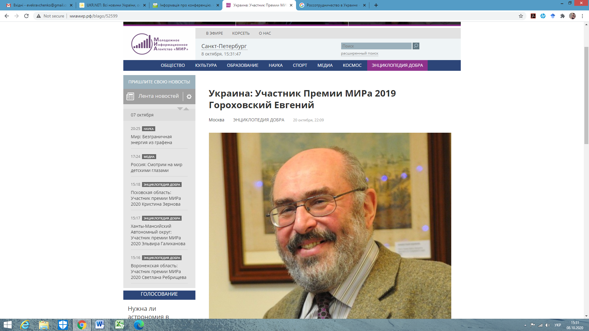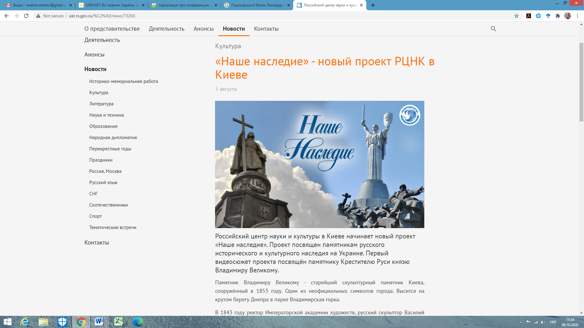 So, let’s look at a few projects. Information on the activities of “Rossotrudnichestvo” and “Russian Center for Science and Culture” is open and available on their official websites, as well as the websites of partner organizations and news agencies. One of the first news about the activities of these organizations, according to the search engine GOOGLE, is the report of the Russian Youth Information Agency “Mir” about the nominee for the award of this agency Mr. Eugene Gorokhovsky from Kiev, who is a staff member of “Rossotrudnichestvo” and “Russian Center for Science and Culture in Kiev”. The report states that the activities of this employee are to give lectures, record YouTube programs, etc. I was interested in this information,because I had not heard about the activities of these two organizations in Ukraine for a long time and I was sure that it had been stopped a long time ago.