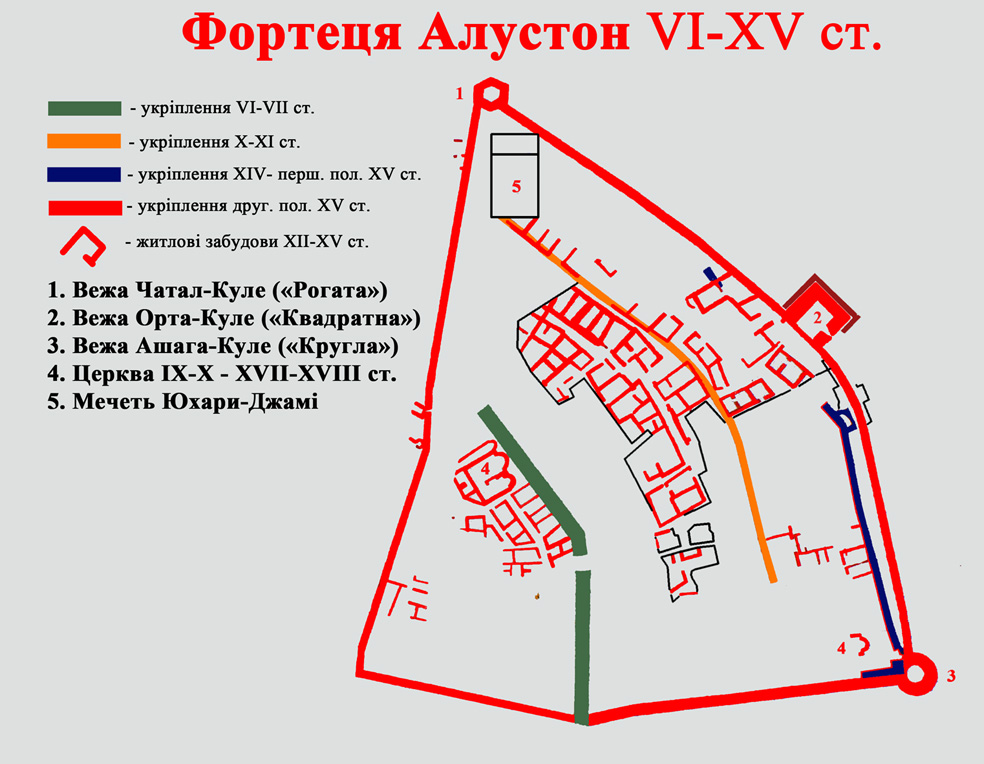 Вперше про фортецю Алустон згадує візантійський історик Прокопій Кесарійський (VI ст.) в своєму трактаті «Про споруди». За його свідченням, гарнізон фортеці складався з остготів, які служили а правах федератів. У той час, в правління імператора Юстиніана I (527–565), Крим перебував у сфері зовнішньополітичних інтересів Візантії.  Хоча Прокопій Кесарійський охарактеризував фортецю, як таку, що витримає будь-який штурм, наприкінці VII сторіччя Візантія полишила Крим, кинувши Алустон на поталу долі. Хазарський каганат приєднав цю територію.