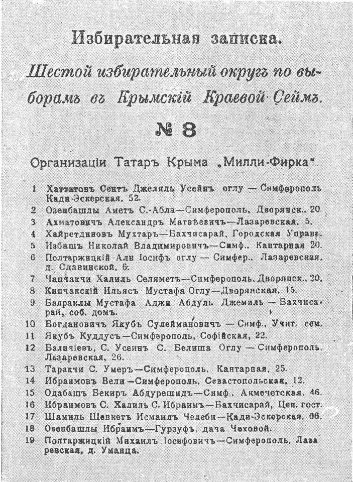До першого складу ЦК партії Міллі Фірка увійшли Челебіджан Челебієв, Джафер Сейдамет, Асан-Сабрі Айвазов, Сеітджеліль Хаттатов, Амет Озенбашли, Джафер Аблаєв, Абдул Хільмі (Ільмі). Міллі Фірка поставила собі за завдання створення національно-культурної автономної Кримської державності.