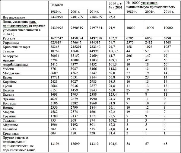 Таким чином, за офіційними даними перепису, з 302 тисяч дітей, що народилися в 2010-2014 роках, приблизно 67% — росіяни, 17% — кримські татари і «просто» татари ще 3% , а українці — 8% (всього лише 24 тисячі). Та якщо подивитися співвідношення у віковій групі 40-50-річних кримчан, то там інша картина. Росіяни — 62%, українці — 18%.