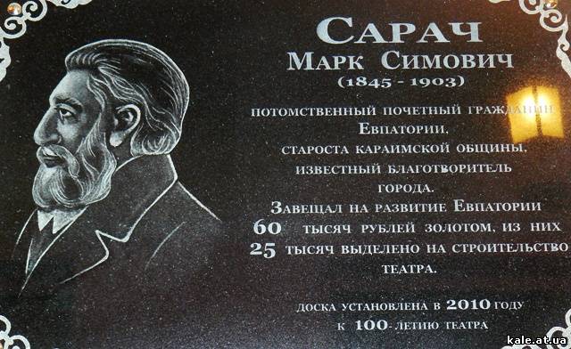 У 1901 р. караїм Мордехай (Марк) Сімович Сарач пожертвував на будівництво театру 25 тисяч карбованців. Він був відомим благодійником, габбаєм караїмської кенаси і гласним міської думи, неодноразово обирався головою Євпаторійського сирітського суду. Але одне діло меценати, й зовсім інше – бюрократи; виділення земельної ділянки під театральну споруду загальмувалося десь у коридорах влади. До того ж все одно не вистачало коштів.
