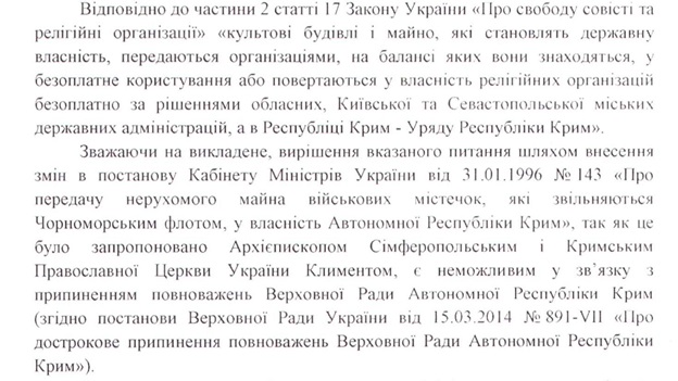 3. Чому Кабінетом Міністрів України не прийняті зміни та доповнення до Проекту Постанови КМУ від 31 січня 1996 року №143 «Про передачу нерухомого майна військових містечок, які звільняються Чорноморським флотом, у власність Автономної республіки Крим та у власність м. Севастополя» та не прийнята Постанова КМУ передати безоплатно у власність Управління Кримської Єпархії Української православної церкви Київського патріархату будівлю № 1 військового містечка № 119, розташованого по вул. Севастопольська, 17, кв. № 548 в м. Сімферополь Автономної Республіки Крим», пропозиції яких були запропоновані та направлені Представництвом Президента України в Автономній Республіці Крим щодо вирішення питання захисту існування Кримської Єпархії УПЦ КП (нині Кримська Єпархія ПЦУ (УПЦ) на тимчасово окупованій території АР Крим? (Пропозиції щодо вирішення цього питання були направлені листами Представництва Президента в АР Крим за №01/354/01-08 від 14 липня 2015 року до Урядового уповноваженого у справах Європейського суду з прав людини, за №01/281/01-08 від 29 травня 2015 року до Віце-прем`єр міністра – Міністра культури України, за №01/199/01-08 від 29 квітня 2016 року до Прем`єр-міністра України). Окрім цього в 2018 році з цього питання було дано доручення Президента України до Кабінету Міністрів України (Лист до Президента України Архієпископа Сімферопольського і Кримського КЛИМЕНТА від 19 травня 2018 року за №01/02-08).