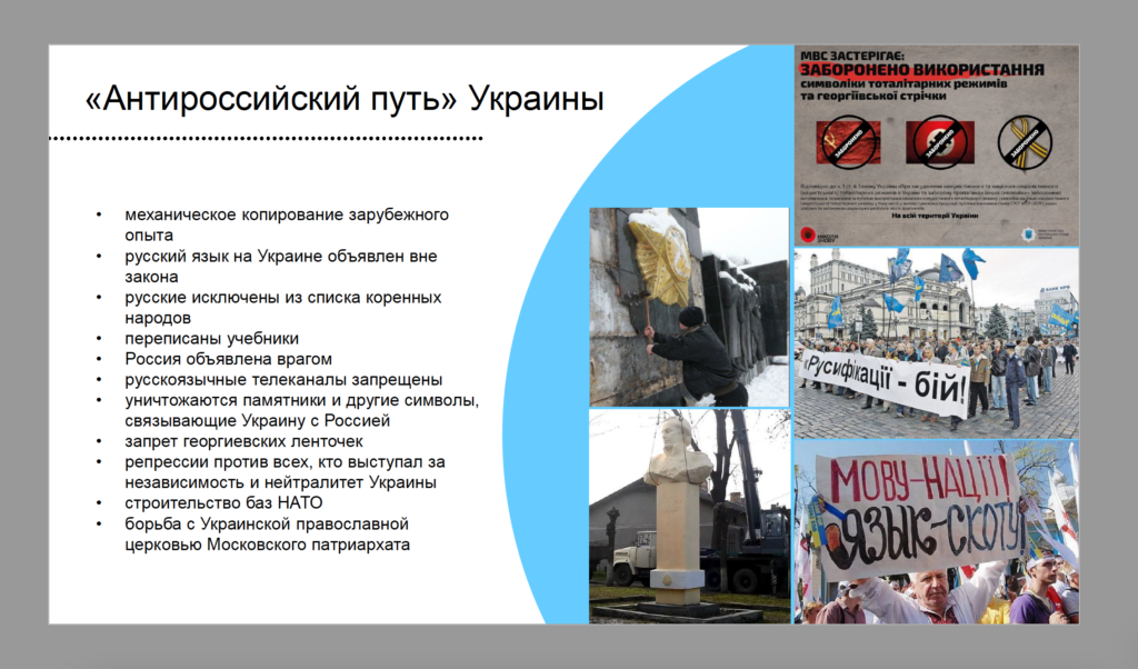 8 років Росія «під посиленим тиском американських і західних партнерів надавала необхідну підтримку своїм братам, що стали жертвами бомбардувань та української хунти». І весь цей час Росія передчувала, що рано чи пізно «величезна посилена українська армія, обдурена, налаштована щодо Росії виключно ненависницьки, нападе на нашу країну» – мовляв, саме «війна на винищення та уярмлення, з використанням ядерної зброї» була метою України у перспективі найближчих 3-4 років (!!!), тож Росія не стала чекати цього жахливого сценарію і «пішла на випередження»: спочатку оголосила «незалежними державами» так звані «Донецьку та Луганську народні республіки», після чого на їхнє прохання розпочала «знищувати військових потенціал» України – «фашистської держави, створеної лише з метою підкорення Росії» (!!!). Разом з тим викладачі та вчителі мали запитати свою аудиторію, чого вони хочуть насправді – «підтримувати далі фашистський режим в Україні, який задурює пропагандою своїх громадян, немов німців перед ІІ світовою війною. чи встановити нарешті мир, завершуючи поточну війну, що тривала сім років, і зберігаємо нашу улюблену країну». Подібним чином російські окупанти вели пропаганду серед населення Криму в березні 2014 року, пропонуючи йому під час «референдуму щодо статусу півострова» обирати між Росією та міфічним «українським фашизмом».