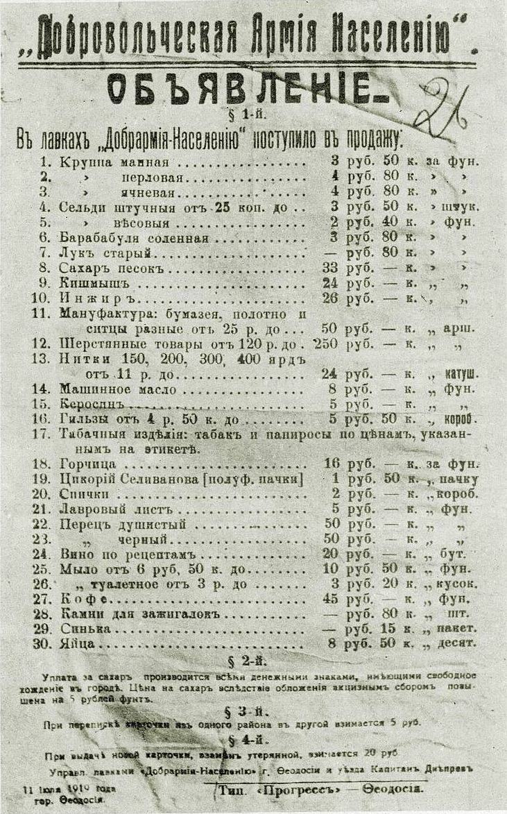 Згідно з домовленостями між Добровольчою армією та Антантою, після початку управління Кримом Денікіним розпочалося постачання до країн Антанти продовольчих товарів. Це призвело до того, що ціни на продукти харчування різко зросли. З наведеної нижче таблиці можна побачити, якою була у жовтні 1919 р. вартість продуктів першої необхідності: